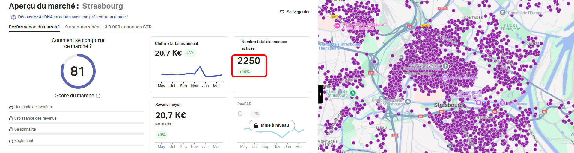 Cette capture d’écran extraite de Airdna, un outil d’analyse de marché en location courte durée illustre parfaitement la densité de la concurrence.